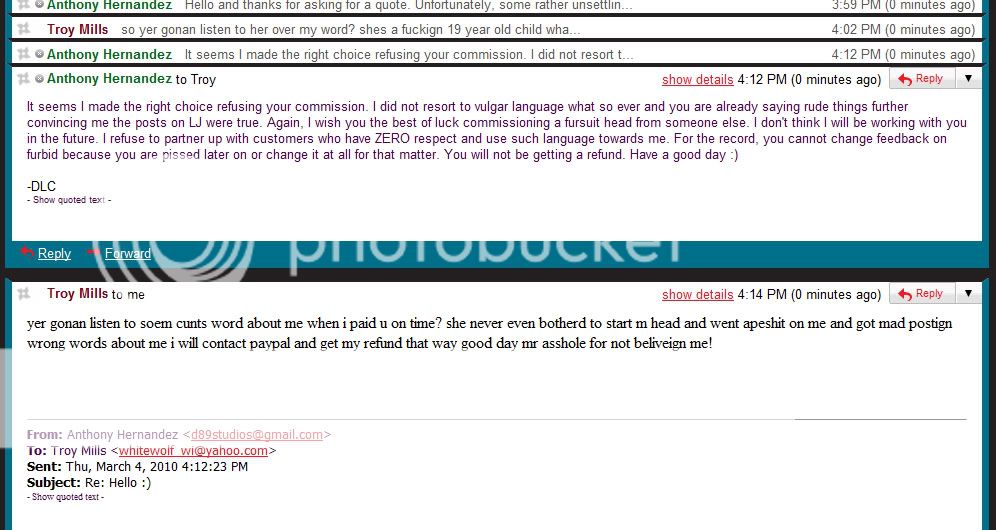 http://i318.photobucket.com/albums/mm401/ah_editing/troy6.jpgResolved (I think)He's said hes going to get his friend to sell the items for him. He told me goodbye. He wanted me to delete my comments/entry here on A_B and on the entry in the fursuit LJ and he'd drop the subject but I'm not about to do that. As of right now, I'm pretty sure the case is resolved. He dropped the claim against me, he said hes going to try and sell the paws to someone.